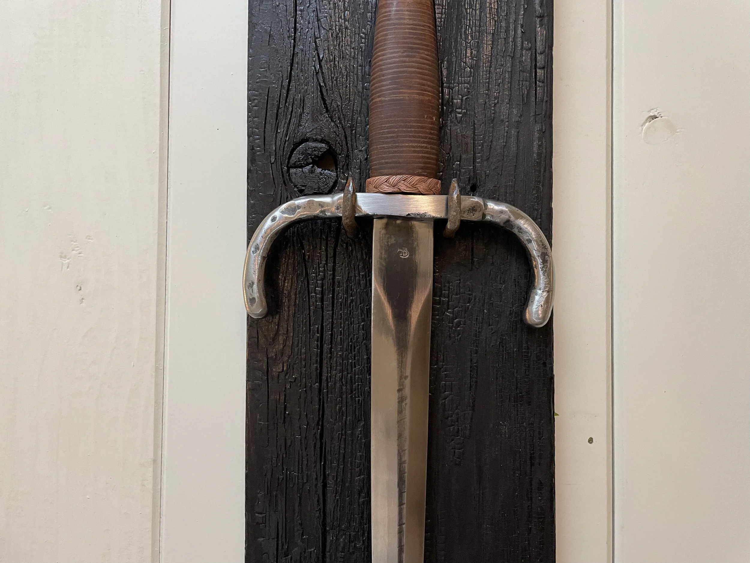 This dagger is a recreation from the Game of Thrones series where Jon Snow uses it to kill Daenerys. It is only seen briefly and does not have a name. The blade is made form a high speed steel planer blade for wood working, reshaped and re-heat treated. The bolster is formed from mild steel round stock as is the pommel. The handle is stacked leather and finished with patina-ed braided copper bands on top and bottom. I included a shou sugi ban wall mount to capture the piece in all it glory.
